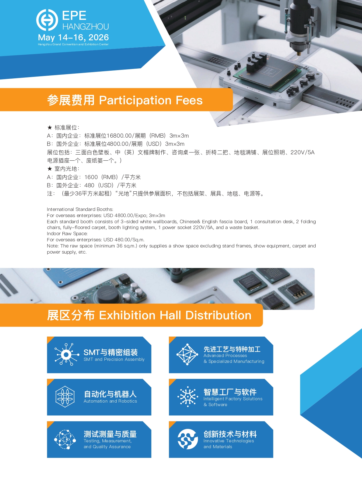 The exhibits cover a wide range of categories, such as electronic production equipment, surface mount technology (SMT), wire harness and connector manufacturing technologies, coil production technologies, testing, measurement, and quality assurance, hybrid component manufacturing, electronics assembly automation, production logistics and intralogistics technologies, industrial robots, sensors and actuators, motion control systems, dispensing and coating, chemical materials, surface treatment, cleaning technologies, micro-assembly and advanced materials, flexible and printed electronics, digital factories, intelligent warehousing, IT and software and electronic manufacturing services, etc.